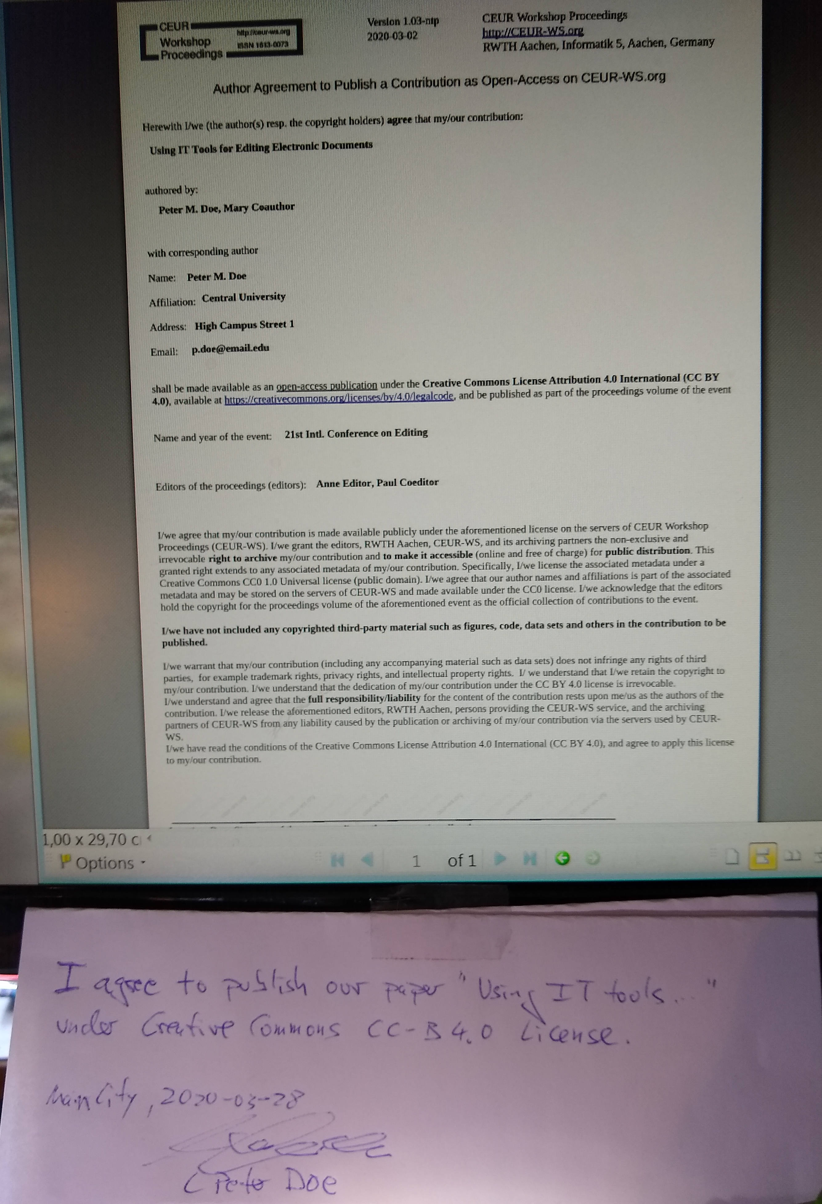 CEUR-WS.org is committed to publishing proceedings with a long term sustainability, both from a legal and from a technical perspective, and in a way that works easily for a wide audience. At the time of this writing (2016), trustable digital signatures based on cryptography would require considerable technical experience and infrastructure both on the side of the volume editors and on our side. So far, a scan or photograph of a hand-written signature on printed paper is the only signature that meets all these requirements. All kinds of digital imagery that does not involve cryptography, such as hand signatures produced with a digital pen, are too easy to forge, and thus not acceptable. Note that we do not regard signatures made on touch-sensitive screens as valid.